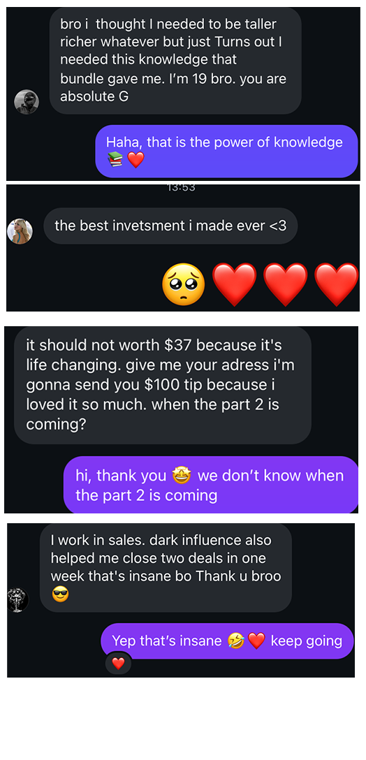 - The Dark Influence : 50+ manipulation & persuasion techniques.